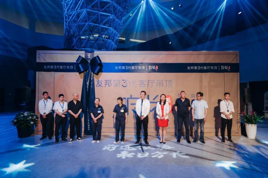 本次發(fā)布會時董特邀了12位特殊的嘉賓為新品揭幕,他們來自研發(fā)一線、生產(chǎn)一線、銷售終端、實(shí)際用戶。在線上線下十萬觀眾朋友們的見證下,美國杜邦王聰 女士、5K木子公司馬再良、筑家子公司余靖華、研發(fā)核心成員丁云斌、吳戴明、焦盟盟 、制造部大板車間班長張德慧、品質(zhì)部翁美麗、經(jīng)銷商代表黃偉清、楊敏、高琪,用戶代表阮水金在發(fā)布會現(xiàn)場共同拆開了一份神秘的禮盒。隨著禮盒的揭開,友邦第3代客廳吊頂“方長”系列終于露出了真容。