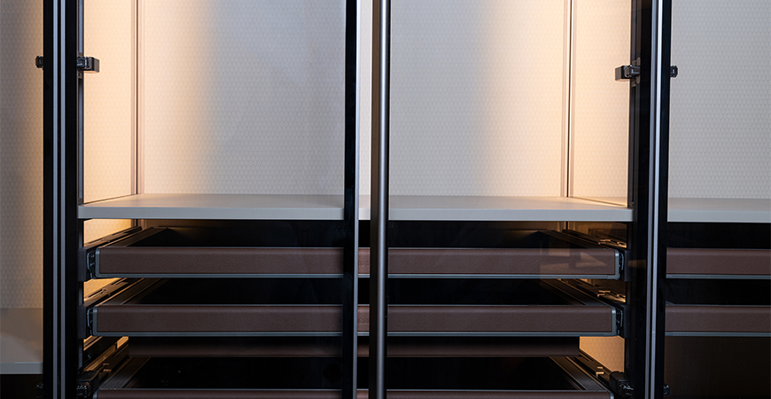 柜內線燈位于立柱槽口向內照射,不刺眼,且光線不會被懸掛的衣物等收納物品遮擋,方便物品的取用。